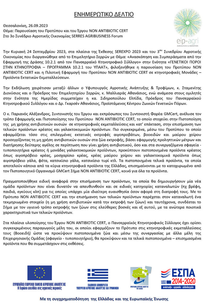 ΠΑΡΟΥΣΙΑΣΗ ΤΟΥ ΠΡΟΤΥΠΟΥ ΚΑΙ ΤΟΥ ΕΡΓΟΥ NON ANTIBIOTIC CERT ΣΤΟ 3ο ΣΥΝΕΔΡΙΟ ΑΓΡΟΤΙΚΗΣ ΟΙΚΟΝΟΜΙΑΣ SERRES AGRIBUSINESS FORUM26/09/2023Περισσότερα